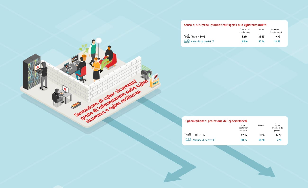 Lo studio mostra anche che molte PMI stimano la propria resilienza maggiore di quanto non sia in realtà. Il 42% delle aziende dichiara di sentirsi ben protetto contro i cyber attacchi, un calo significativo rispetto al 55% dell’anno precedente. Allo stesso tempo, lo studio mostra che solo il 32% delle PMI svolge regolarmente corsi di formazione e solo il 30% dispone di un piano di emergenza.