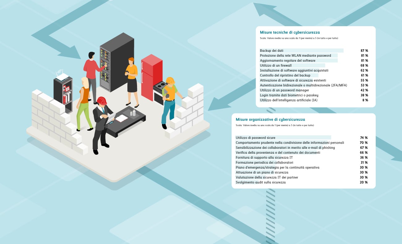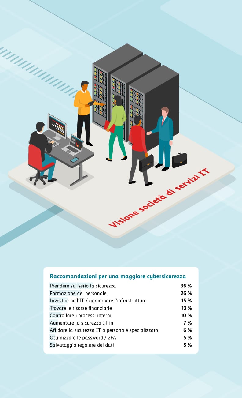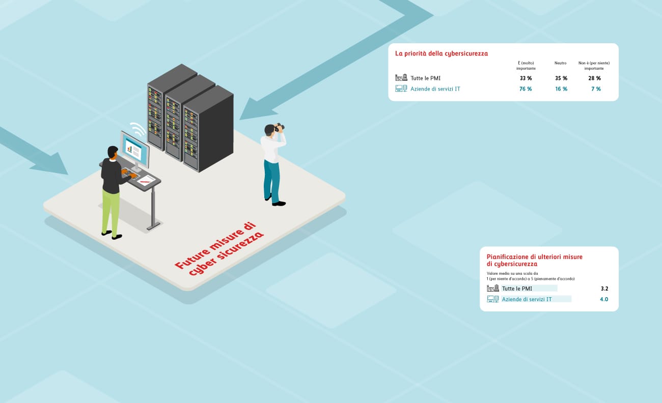 Soluzioni tecniche come firewall e aggiornamenti del software sono importanti, ma da sole non bastano. Piani di emergenza, corsi di formazione e processi chiari sono essenziali per essere preparati agli attacchi. Ma proprio qui c’è bisogno di recuperare terreno: solo il 31% delle PMI svolgono regolarmente corsi e solo il 30% ha implementato un piano di emergenza o una strategia per la sicurezza.